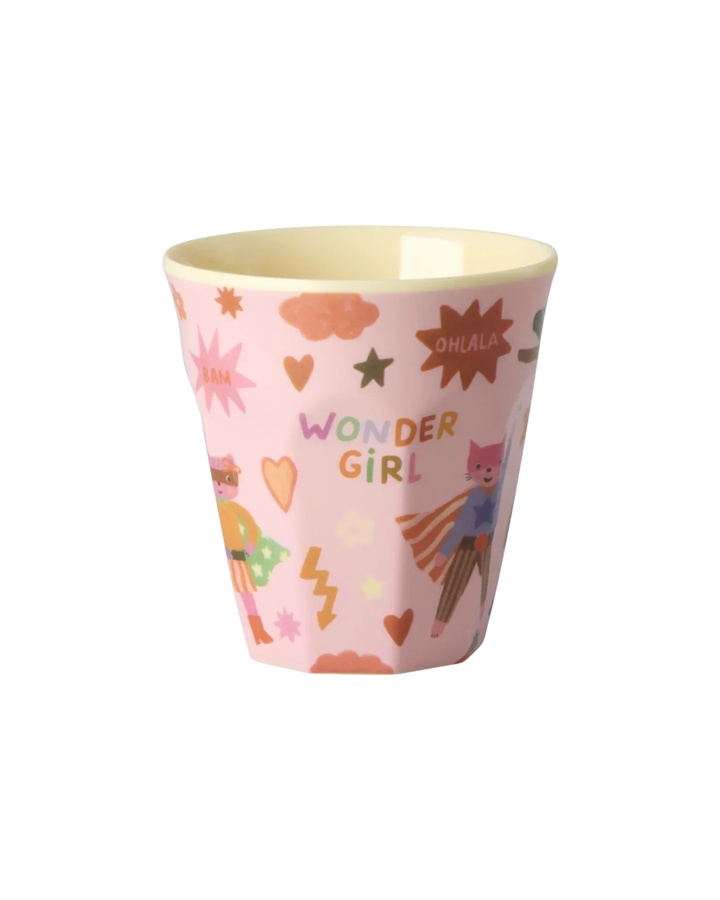 Het populaire melamine bekertje voor kinderen - met een heldenthema print in roze tinten. Melamine is duurzaam en ideaal voor dagelijks gebruik, omdat het sterk en makkelijk schoon te maken is. Het materiaal zorgt ervoor dat het bekertje voor van alles en nog wat te gebruiken is - als drinkbeker, voor hapjes of kleine spulletjes, voor een picknick of mooie bloemen.